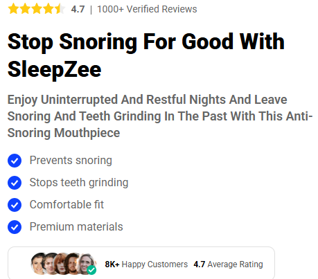 Stop Snoring For Good With SleepZee. Enjoy Uninterrupted And Restful Nights And Leave Snoring And Teeth Grinding In The Past With This Anti-Snoring Mouthpiece. Prevents snoring. Stops teeth grinding. Comfortable fit. Premium materials. Your Discount Has Been Applied. Why Choose SleepZee. Over 75,000+ Happy Customers. Everyone who tries SleepZee products says they’re a must-have to combat snoring. We invest a lot of dedication and expertise into making our products, so you can enjoy seeing results when using them. Professional Customer Support. Our customer service is available 24/7 for your satisfaction. Don’t hesitate to contact us anytime. Over 3,000 5-Star Reviews. Emily R. Verified Buyer. Life-Changing Product! SleepZee has completely transformed my sleep quality! I used to wake up multiple times a night due to my husband’s snoring, but now we both sleep soundly. It’s a miracle worker… everyone should invest in their own SleepZee if they suffer from snoring. Mark L. Verified Buyer. No More Sleepless Nights. I’ve tried countless remedies for my snoring, but nothing worked until I found this mouthpiece. It’s comfortable and effective, and super easy to fit to my mouth shape. My wife is thrilled, and I’m finally getting uninterrupted sleep. Sarah J. Verified Buyer Best Investment for Better Sleep. I got this anti-snoring mouthpiece for both of my parents after both of them spent weeks complaining about the other one’s snoring problem. It took a bit of convincing for them to try this mouthpiece, but once they finally tried it out – complete bliss! Now both of them are in a better mood and I haven’t heard another complaint about snoring. Tom W. Verified Buyer. Silent Nights Are Back. SleepZee has made a huge difference in my life. My snoring was causing so many issues and even affecting my health, but now it’s a thing of the past. I can’t believe how effective this mouthpiece is. Rachel M. Verified Buyer. Restful Sleep Restored. Thanks to this mouthpiece, I no longer feel self-conscious about my snoring. This has made traveling for work and staying at a hotel a much more peaceful experience.. David K. Verified Buyer. Finally, a Solution That Works. I’ve been struggling with teeth grinding in my sleep. It was really annoying to my partner, and my doctor kept telling me that it was creating some real issues with my dental health. Then I was recommended this mouthpiece, and guess what? It works wonderfully. I have completely stopped grinding my teeth, and it has even improved my sleep quality. Jessica H. Verified Buyer A True Sleep Savio SleepZee has saved my marriage! My snoring was driving my husband crazy, but now we both sleep peacefully. It’s comfortable, easy to wash and reuse, and the results are incredible. If you’re suffering from snoring, you must try out this mouthpiece! WAREHOUSE SALE -70% OFF | Limited Time Offer